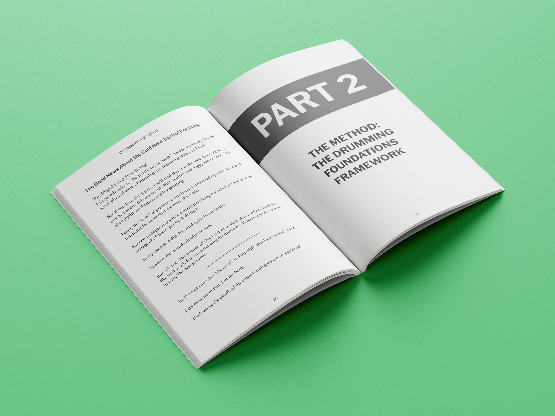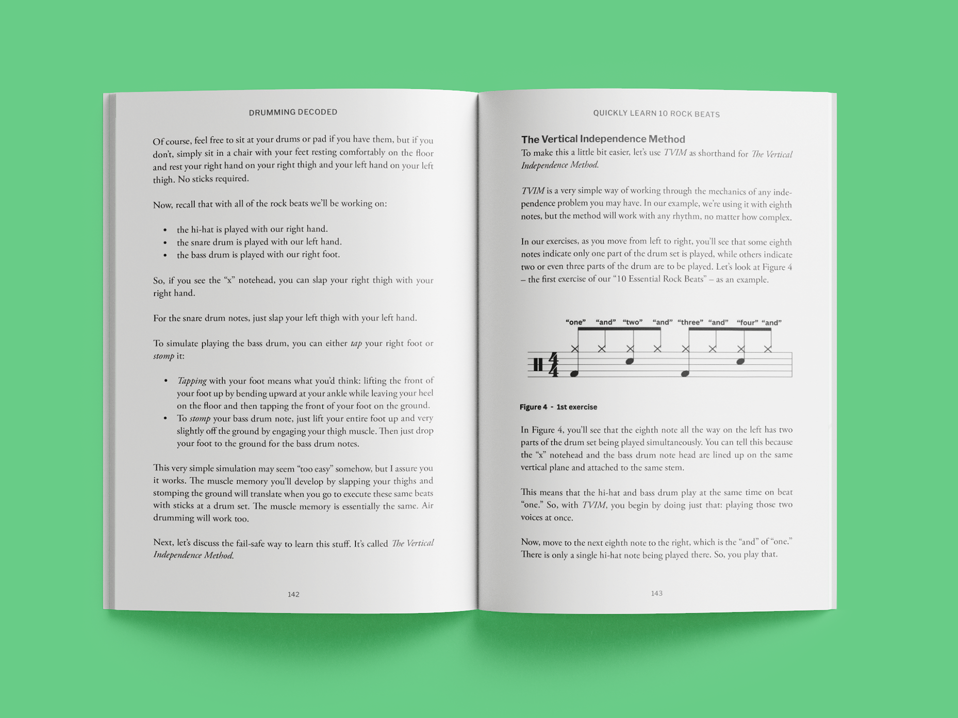 This instructional handbook for beginning drummers was designed as a digital download exclusive to the author's website. Priorities were clarity, simple and straightforward design, speedy production, and ease of home printing. Unlike a novel, this book included many subheaders, callout boxes, lists, and diagrams.